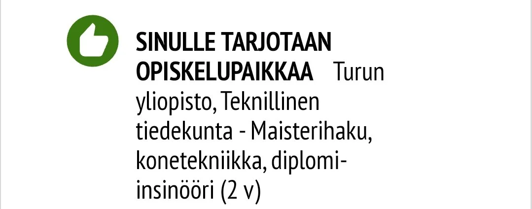 Konetekniikan maisterihaun erikoisuutena oli käytössä olevat valintaperusteet: AMK tutkintotodistuksen painotettu keskiarvo ja “motivaatiokirje.” Olisin jotenkin olettanut, että tätäkin varten pitäisi käydä pääsykokeissa. Vaikka AMK keskiarvoni oli kohtalaisen hyvä ja motivaationi kohdillaan, jännitti opiskelijavalinnan tulosten odottaminen ihan hirveästi.